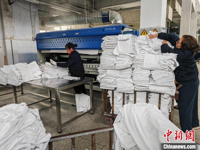 臥具從工業(yè)洗衣機(jī)里撈出后,就進(jìn)入烘干、消毒、熨燙工序,從進(jìn)入烘干機(jī)到再從熨燙機(jī)出來,只需10秒,原本滴水的臥具就變得干燥平展。這對負(fù)責(zé)折疊、打包的洗滌工手速有著極高的要求。