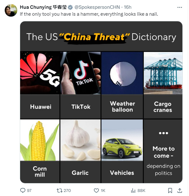 此外,在另一條貼文中,華春瑩表示,“如果你唯一的工具是錘子,那么所有東西看起來都像釘子。”