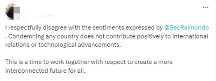 一名外國網友表示,雷蒙多喜歡“散布恐懼,而非進行建設性的討論”,而“中國制造的汽車比美國汽車更好、更便宜”。