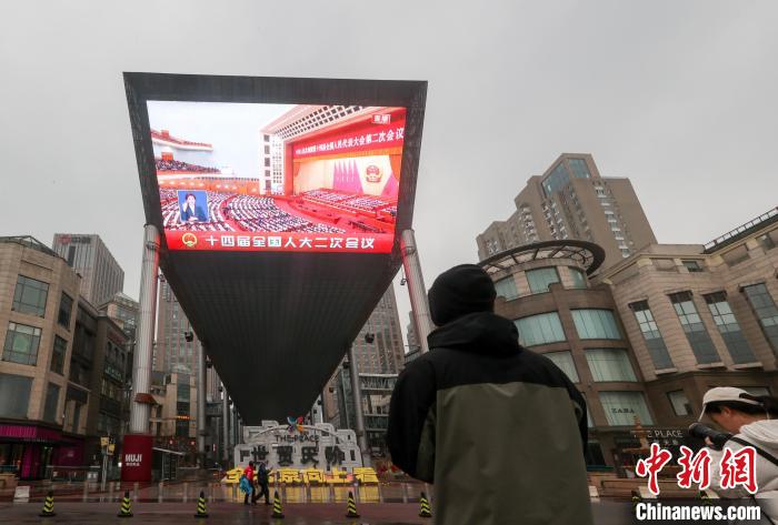 3月5日,十四屆全國人大二次會(huì)議在北京人民大會(huì)堂開幕。圖為北京一戶外大屏播放開幕會(huì)?!≈行律缬浾?賈天勇 攝