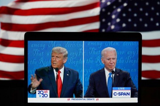 這張2020年10月22日在美國(guó)弗吉尼亞州阿靈頓拍攝的視頻畫面顯示,時(shí)任美國(guó)總統(tǒng)特朗普(左)與當(dāng)時(shí)的民主黨總統(tǒng)候選人拜登在田納西州納什維爾市參加最后一場(chǎng)總統(tǒng)候選人電視辯論。新華社記者 劉杰 攝