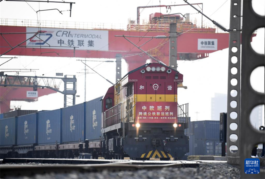 3月7日,中歐班列(越南·河內(nèi)——中國·西安——匈牙利·布達(dá)佩斯)跨境公鐵聯(lián)運班列從西安國際港站駛出。新華社記者 李一博 攝