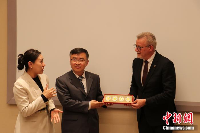 中國(guó)社會(huì)科學(xué)院領(lǐng)導(dǎo)與巴西坎皮納斯州立大學(xué)校長(zhǎng)互換禮物。 中新網(wǎng)黃方 攝