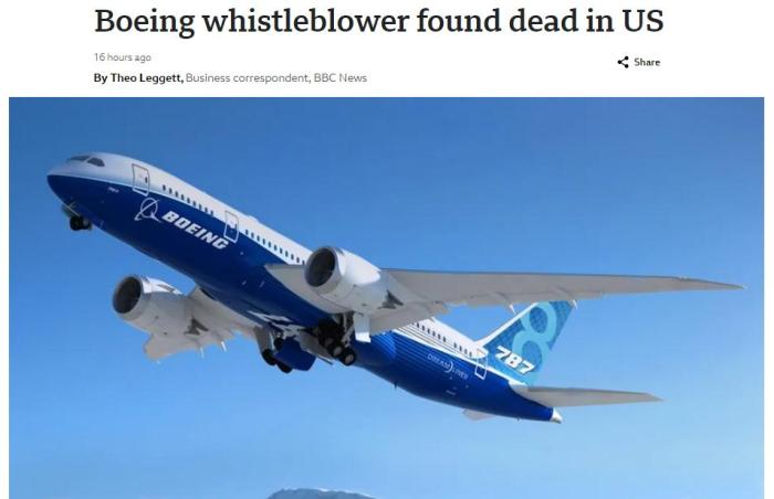 據(jù)BBC最新消息,這名曝光波音質(zhì)量亂象的“吹哨人”,于2024年3月9日被發(fā)現(xiàn)在美國(guó)一家酒店停車場(chǎng)內(nèi)身亡,事件正在調(diào)查中。
