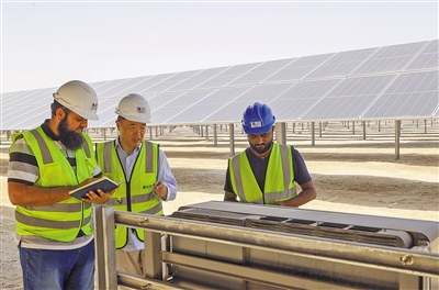 由中國(guó)企業(yè)總承包的阿聯(lián)酋艾爾達(dá)芙拉光伏電站可供20萬(wàn)戶(hù)居民用電,每年減少二氧化碳排放240萬(wàn)噸,使清潔能源在阿聯(lián)酋總能源結(jié)構(gòu)中的比重提高到13%以上。圖為中外員工在艾爾達(dá)芙拉光伏電站工作。