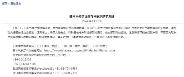 中新網(wǎng)4月3日電 據(jù)中國駐日本大使館官網(wǎng)消息,4月3日,日本氣象廳就沖繩本島、宮古島等地區(qū)發(fā)布海嘯預(yù)警。中國駐日本大使館提醒有關(guān)地區(qū)中國公民密切關(guān)注氣象預(yù)警和防災(zāi)信息,遵照防災(zāi)提醒做好應(yīng)急避難,遠(yuǎn)離海邊,確保人身安全。特別是在海岸附近感到地震后,應(yīng)立即到高處避難。注意海嘯可能會(huì)反復(fù)來襲,不要因?yàn)槿|西或觀察情況而靠近海岸。如遇緊急情況,請(qǐng)及時(shí)撥打日本緊急求助電話,并聯(lián)系駐日本使領(lǐng)館求助。