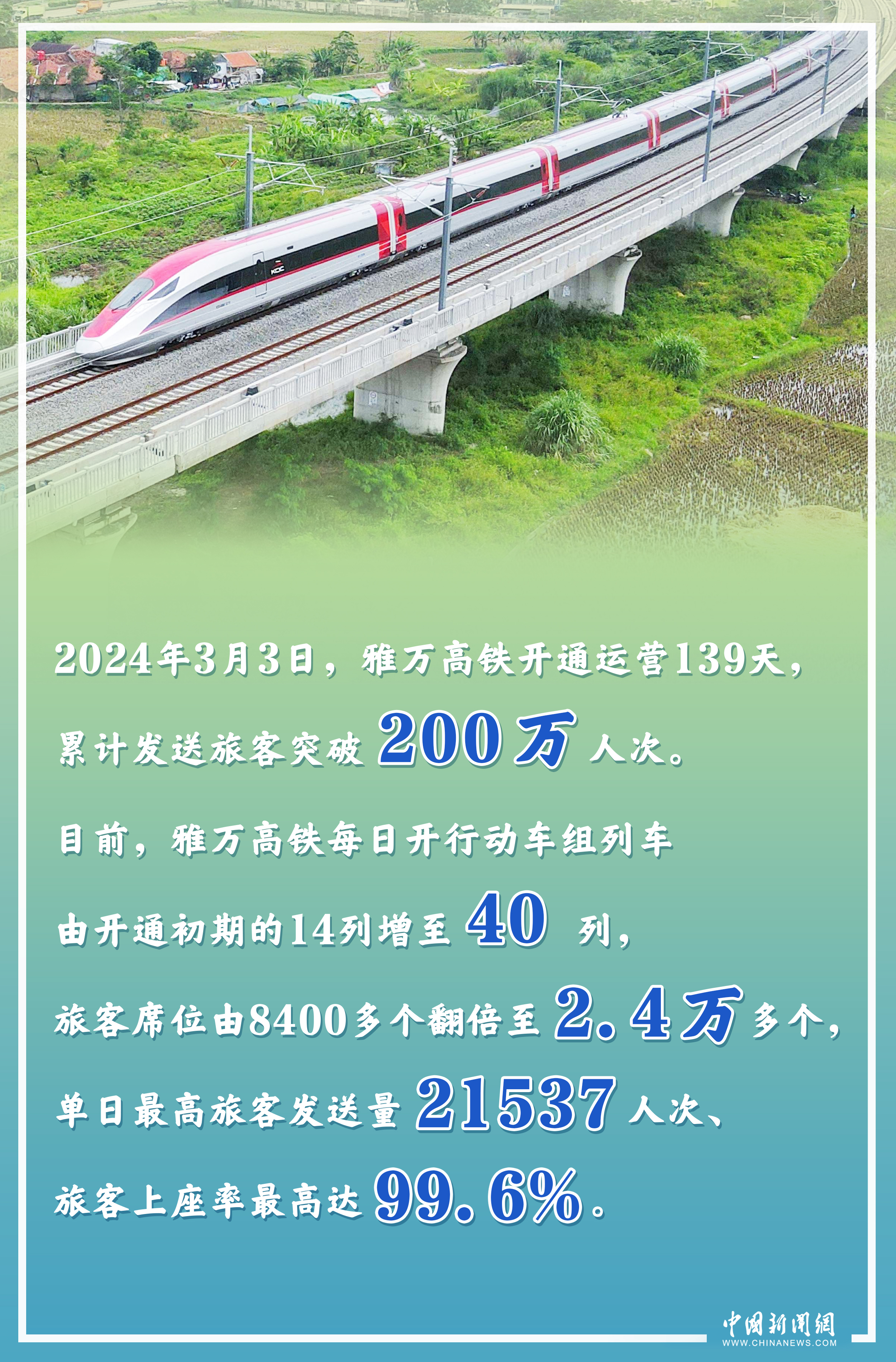 作為中國(guó)與印尼共建“一帶一路”的“金字招牌”,截至當(dāng)?shù)貢r(shí)間2024年3月3日,印尼雅萬(wàn)高鐵累計(jì)發(fā)送旅客突破200萬(wàn)人次,單日旅客上座率最高達(dá)99.6%,客流持續(xù)保持高位態(tài)勢(shì)。