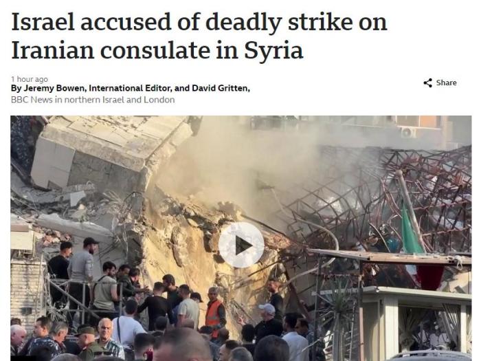報道援引伊朗駐敘利亞大使侯賽因·阿克巴里的話稱,伊朗大使館旁邊的領(lǐng)事部門建筑“遭到以色列F-35戰(zhàn)機(jī)發(fā)射的六枚導(dǎo)彈襲擊”。伊朗媒體發(fā)布的視頻還顯示,現(xiàn)場遭到嚴(yán)重破壞,并起火冒煙。