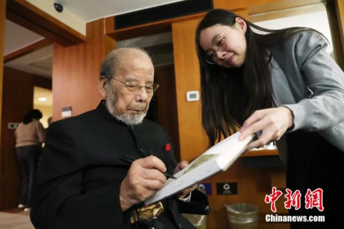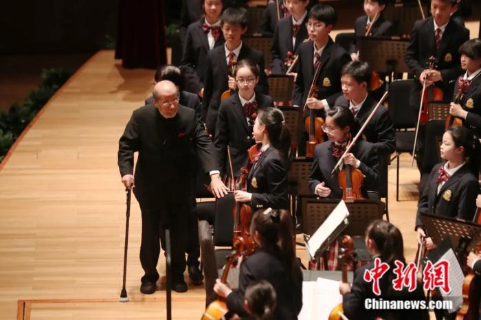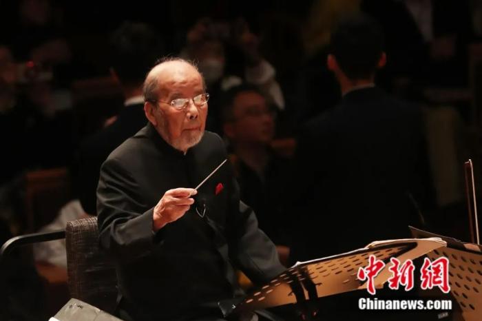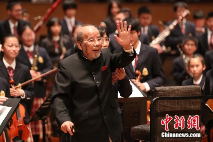 音樂會(huì)的尾聲,99歲高齡的中國著名指揮家曹鵬在長達(dá)一分半的掌聲中登上指揮臺。