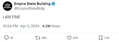 地震發(fā)生幾分鐘后,紐約地標(biāo)建筑帝國(guó)大廈的官方社交媒體賬號(hào)發(fā)文稱:“我很好”。