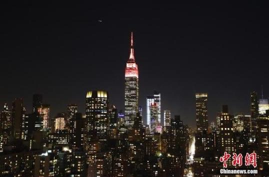 資料圖:美國(guó)紐約帝國(guó)大廈(中)亮燈。中新社記者 廖攀 攝