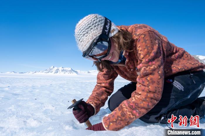 科考人員在南極藍(lán)色冰區(qū)進(jìn)行冰層取樣。照片拍攝于智利安塔科研究所(INACH)2022年對(duì)南極洲埃爾斯沃斯山脈聯(lián)合冰川的實(shí)地考察任務(wù)期間(圖片來自智利圣地亞哥大學(xué)Jose Jorquera)。施普林格·自然/供圖