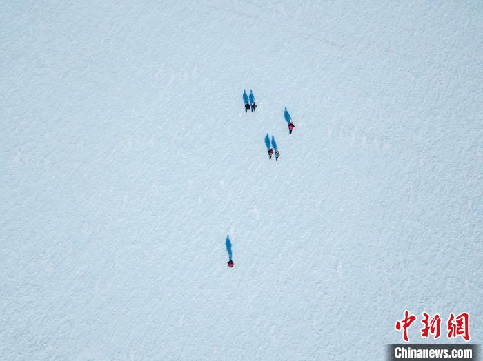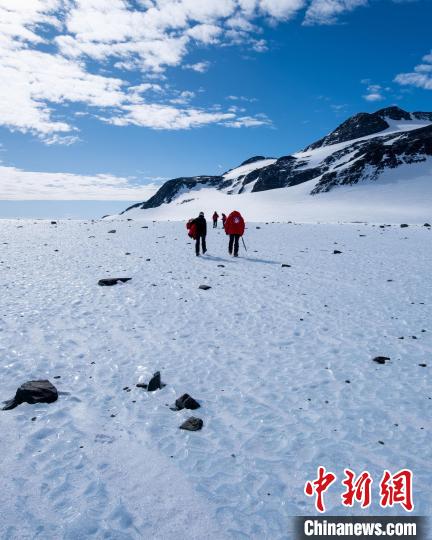 藍(lán)冰上的科學(xué)家、野外向?qū)Ш陀浾?。照片攝于智利南極研究所(INACH)2022年對(duì)南極洲埃爾斯沃斯山脈聯(lián)合冰川的實(shí)地考察(圖片來自智利圣地亞哥大學(xué)Jose Jorquera)。施普林格·自然/供圖
