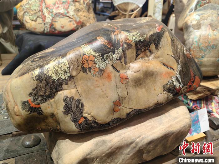 人物清晰的下頜線、凸起的鼻子、閉著的眼睛……石頭上原有的凹凸紋理在魯婷的畫筆下被勾勒得栩栩如生。