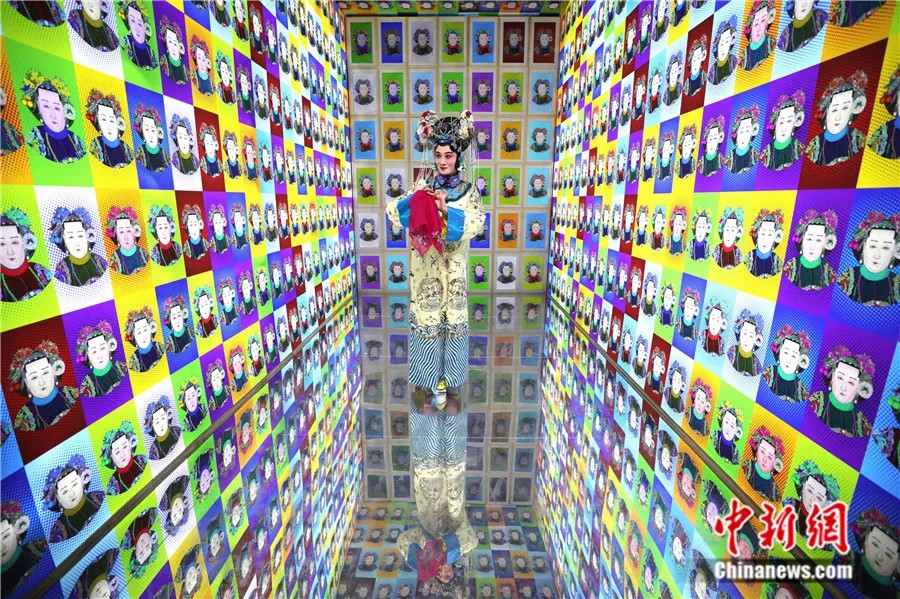 在2022年中國國際服務(wù)貿(mào)易交易會上,經(jīng)過數(shù)字技術(shù)再創(chuàng)作的戲劇人物形象,吸引一名京劇演員駐足。趙雋 攝
