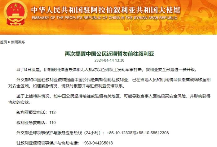 使館消息稱,4月14日凌晨,伊朗使用彈道導(dǎo)彈和無(wú)人機(jī)對(duì)以色列領(lǐng)土發(fā)動(dòng)軍事打擊,敘利亞安全形勢(shì)進(jìn)一步升級(jí)。