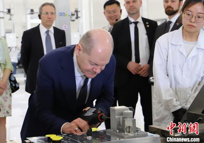 圖為朔爾茨(左一)了解博世與中企合作的最新成果。中新社記者 賈楠 攝