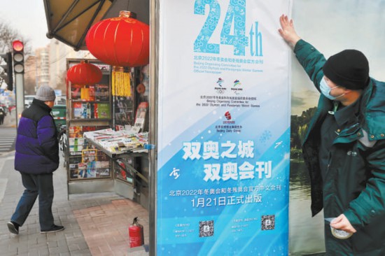 昨天上午,位于廣渠門內(nèi)大街富貴園購物中心前的郵政報刊亭旁,三位來自北京郵政的工作人員正忙碌著。很快,三張印有“雙奧之城,雙奧會刊”“北京2022年冬奧會和冬殘奧會官方中文會刊1月21日正式出版”等字樣的嶄新海報貼上了報刊亭的公益宣傳欄。以白色和藍色為主色調(diào)的主題海報剛剛貼好,就立刻吸引了過往路人的駐足觀看:“這海報真有冬奧氛圍。”“冬奧會刊?到時候得來一份看看。”不少路人掏出手機,對著海報上的預(yù)訂二維碼現(xiàn)場掃碼,了解具體情況。