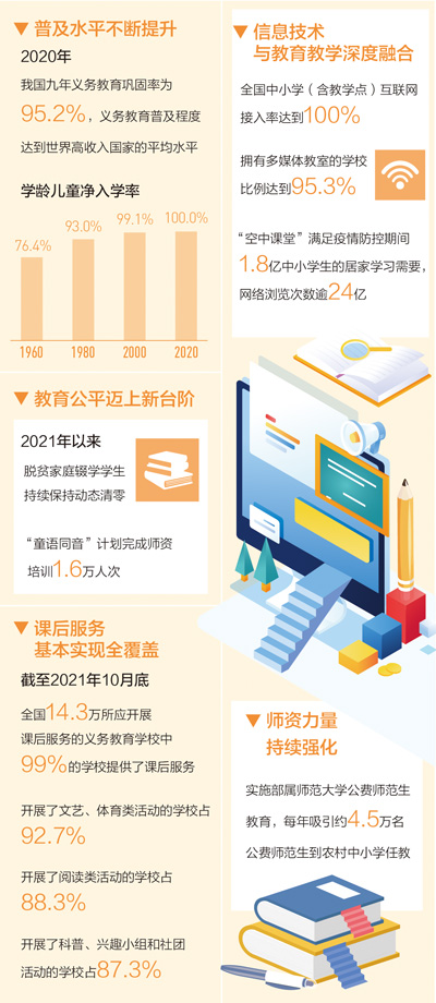 黨的十八大以來,在以習(xí)近平同志為核心的黨中央堅強領(lǐng)導(dǎo)下,我國義務(wù)教育取得了舉世矚目的成就:2020年,我國九年義務(wù)教育鞏固率為95.2%,義務(wù)教育普及程度達到世界高收入國家的平均水平;實施義務(wù)教育薄弱環(huán)節(jié)改善和能力提升項目,發(fā)展“互聯(lián)網(wǎng)+”教育助力城鄉(xiāng)教育均衡,全國義務(wù)教育基本均衡已經(jīng)全面實現(xiàn)……讓適齡兒童少年有學(xué)上、上好學(xué),讓每個孩子都能享有公平而有質(zhì)量的教育,正在成為現(xiàn)實。