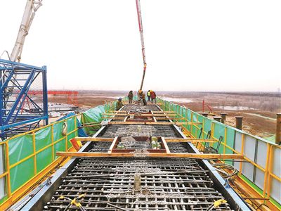 本報(bào)訊(記者 劉洋)1月12日,京雄高速公路(北京段)全線重點(diǎn)控制性工程永定河特大橋再傳捷報(bào),經(jīng)過16個(gè)小時(shí)的晝夜作戰(zhàn),作為京雄高速公路全線最大蓋梁的永定河特大橋西引橋20#墩蓋梁順利澆筑完成,這標(biāo)志著永定河特大橋的上部結(jié)構(gòu)施工帷幕業(yè)已拉開。