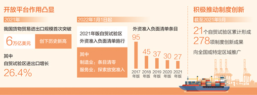 日前,我國2021年外貿(mào)成績單發(fā)布,貨物貿(mào)易進(jìn)出口規(guī)模首次突破6萬億美元。其中,自由貿(mào)易試驗(yàn)區(qū)進(jìn)出口增長26.4%,呈現(xiàn)蓬勃發(fā)展態(tài)勢。