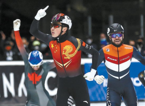 任子威(中)本賽季狀態(tài)出色,發(fā)揮穩(wěn)定,這是他在去年11月底進行的短道速滑世界杯多德雷赫特站比賽中奪得男子1500米冠軍后霸氣慶祝。 新華社供圖