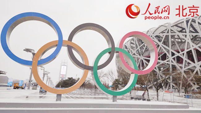 位于“鳥巢”西側的“奧運五環(huán)”形象景觀。 人民網 李博攝