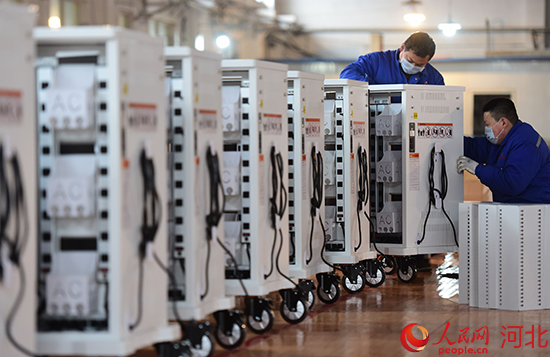 河北海捷現(xiàn)代教學設備公司車間工作人員正在組裝智能充電車。 苑立偉攝