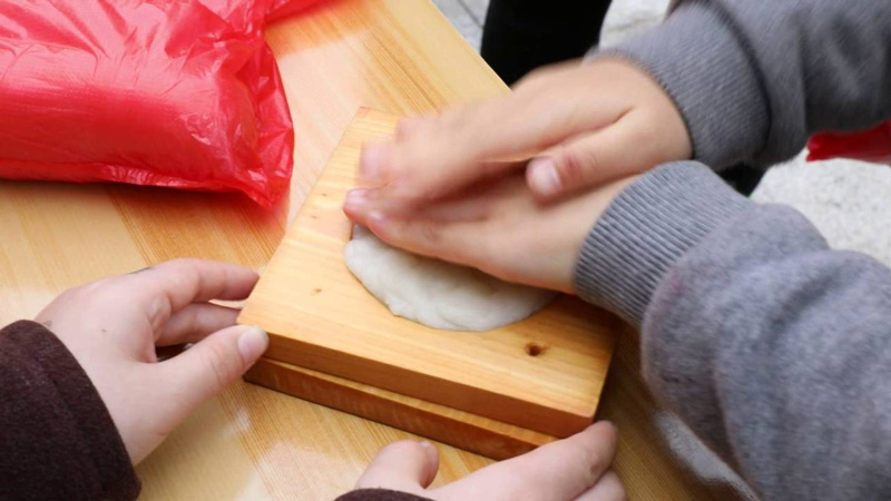 小朋友將糕團放入模具中壓印,年糕就制作出來了。有的小朋友則直接用手將糕團捏成各式各樣的造型,別有一番樂趣。