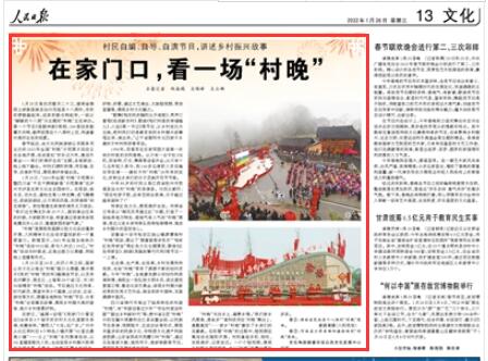 1月25日至26日,農歷小年之際,國家公共文化云推出“村晚”接力云展播,集中展示《我的“村晚”我的年》融媒體節(jié)目,以及來自內蒙古、黑龍江、上海等20個?。▍^(qū)、市)的30場精彩“村晚”活動。節(jié)目通過文化傳承、時代新風、展望未來3個篇章,以訪談、互動、游戲等方式,展播各地特色“村晚”節(jié)目、分享“村晚”臺前幕后故事、展現鄉(xiāng)村振興美好畫卷、推介鄉(xiāng)村美景好物。