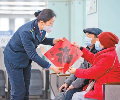 春運期間,南京火車站從細節(jié)著手、小事出發(fā),推出了一系列溫馨服務?!?58”雷鋒服務站購置一批適合兒童使用的口罩,教孩子們?nèi)绾握_佩戴,同時為乘車旅客送上春聯(lián)、窗花或“?!弊帧D為“158”雷鋒服務站客運值班員為旅客送上新春祝福。