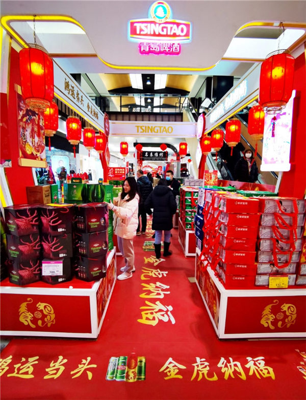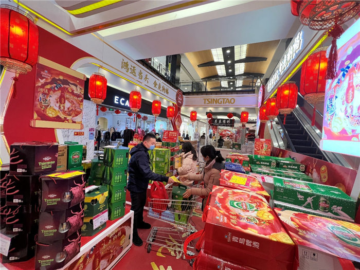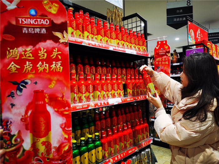 而青島啤酒“百年之旅“憑借獨(dú)一無二的珍惜原材、不惜工本的耗時慢釀、與無與倫比的琥珀原色和恒久回味,也在春節(jié)超高端市場上有叫好叫座?!比ツ曜咴L客戶就送的‘百年之旅’,有特色又有排面,客戶反饋特別好,今年特地團(tuán)購一批,公司年會聚餐也喝他?!澳惩赓Q(mào)公司采購部的劉先生,正在和超市的經(jīng)理談大宗采購,作為青島”特產(chǎn)“的青島啤酒,是他們每年過年的首選禮品,”還有今年推出虎年版的百年鴻運(yùn),特別新年應(yīng)景,配上特有的搖擺蓋開起來特別有氣氛,喜慶。“