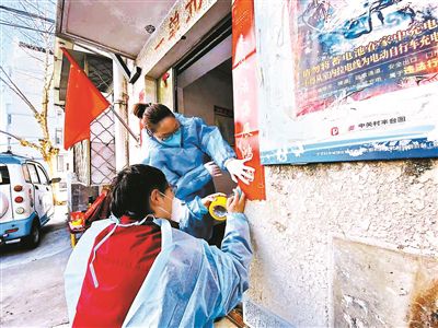 看丹街道工作人員為封控、管控區(qū)的小區(qū)居民貼春聯(lián) 供圖/豐臺(tái)區(qū)政府