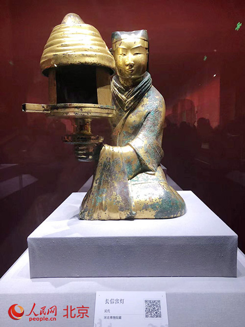 長信宮燈是2000多年前的西漢宮燈,造型輕巧華麗,設(shè)計巧妙環(huán)保。人民網(wǎng)記者 鮑聰穎攝