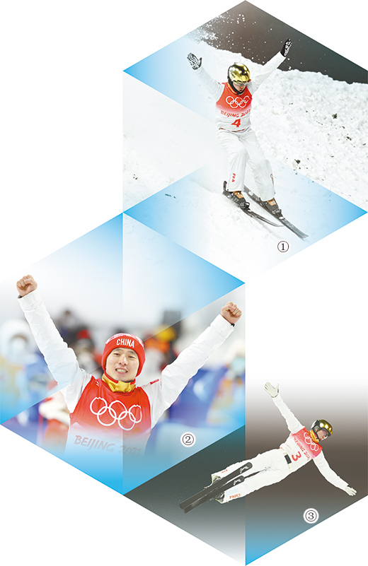 圖①:2月16日,齊廣璞在自由式滑雪男子空中技巧決賽中穩(wěn)穩(wěn)落地。