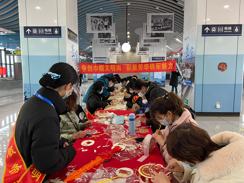 鬧元宵、扎虎燈、猜燈謎……節(jié)日里的杭海城際鐵路各車站熱鬧非凡。在張燈結彩的海寧海昌路站,工作人員熱情邀請乘客參加猜燈謎活動?;顒又?,乘客們有的凝眉思考,有的積極討論,歡歡喜喜猜著燈謎,為節(jié)日里增添了一份歡樂和喜悅。海寧鹽官站又是另一番歡樂的場景,工作人員親自動手,制作出一盞盞漂亮的虎燈,乘客們紛紛圍攏過來駐足觀看,希望在新的一年里贏得“好兆頭”,現(xiàn)場一片其樂融融,歡聲笑語。
