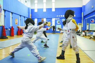 昨天,小學生在鼓樓區(qū)南財大附小參加擊劍社團活動。 南京日報/紫金山新聞記者 徐琦 攝