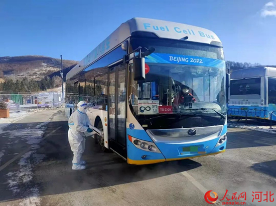 張家口賽區(qū)運(yùn)行保障團(tuán)隊(duì)工作人員在對車輛進(jìn)行消毒工作。 譚磊攝