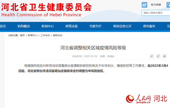 人民網(wǎng)石家莊3月4日電 據(jù)河北省衛(wèi)健委發(fā)布的最新消息,根據(jù)國務院應對新型冠狀病毒肺炎疫情聯(lián)防聯(lián)控機制關于科學劃分、精準防控等工作要求,自2022年3月4日起,河北省將邢臺市清河縣葛仙莊鎮(zhèn)袁宋莊村調整為中風險地區(qū)。
