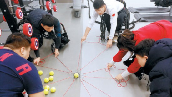 徐守森(右一)帶領(lǐng)輪椅冰壺運(yùn)動(dòng)員通過(guò)互動(dòng)游戲緩解比賽壓力。