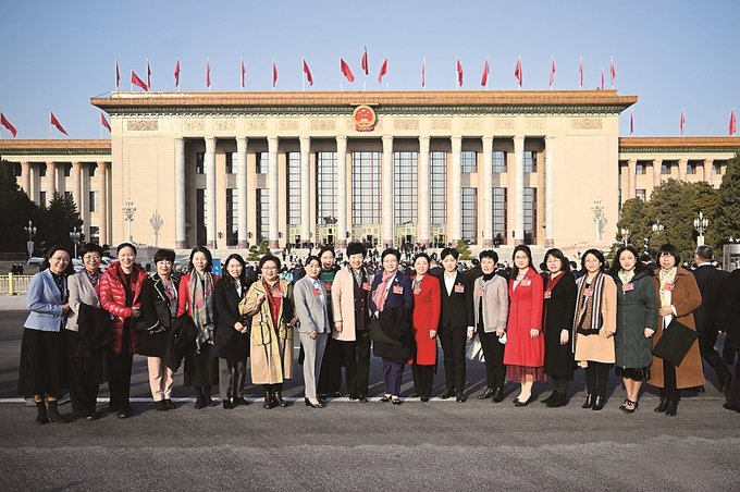 3月8日上午,出席十三屆全國人大五次會(huì)議的江蘇團(tuán)女代表在人民大會(huì)堂前合影留念,共慶“三八”國際勞動(dòng)?jì)D女節(jié)。 本報(bào)記者 吳勝 攝