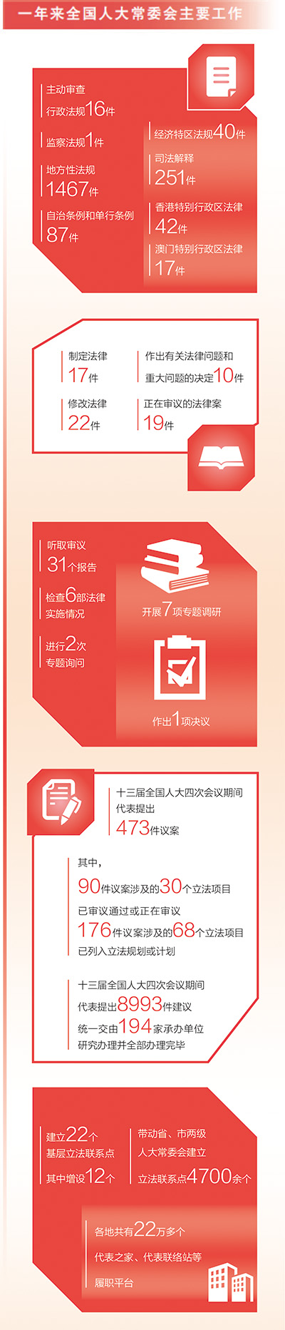 一年來(lái),全國(guó)人大常委會(huì)制定法律17件,修改法律22件,作出有關(guān)法律問(wèn)題和重大問(wèn)題的決定10件,正在審議的法律案19件。