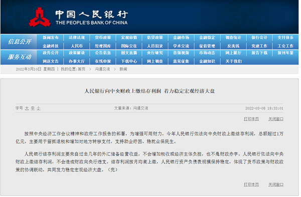 央行上繳萬(wàn)億元結(jié)存利潤(rùn) 專家:增大轉(zhuǎn)移支付惠企利民