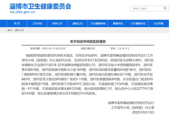 人民網淄博3月13日電(鄭浦麗)據(jù)淄博市衛(wèi)生健康委員會官網消息,根據(jù)國務院聯(lián)防聯(lián)控機制有關規(guī)定,經綜合評估研判,淄博市委統(tǒng)籌疫情防控和經濟運行工作領導小組(指揮部)辦公室研究決定,自2022年3月13日0時起,將周村區(qū)北郊鎮(zhèn)大埠村、周村區(qū)絲綢路東方金源步行街19-22號淄博凌典服裝有限公司、周村區(qū)實驗小學西側順園街9號、周村區(qū)青年路5號院、周村區(qū)新建中路新北小區(qū)16號樓、周村區(qū)鳳陽路鄭家馨苑4號樓1單元、周村區(qū)東門路669號燈塔生活區(qū)、周村區(qū)德陽路蘭馨書苑、周村區(qū)城北街道東塘社區(qū)1號樓、周村區(qū)絲市街663號、周村區(qū)育才路229號棉紡廠宿舍3-1號樓、周村區(qū)御景國際8號樓、永安街道北門街293號院瑞豐櫻桃園1號樓、周村區(qū)南下河街45號匯龍街小區(qū)、文昌湖區(qū)萌三村4號樓、文昌湖區(qū)萌水鎮(zhèn)萌一村1號樓、文昌湖區(qū)萌水鎮(zhèn)水磨村2號樓、桓臺縣荊家鎮(zhèn)荊三村、桓臺縣中心大街2277號蘭香園14號樓、桓臺縣果里鎮(zhèn)沈家社區(qū)3號樓劃為中風險區(qū)。