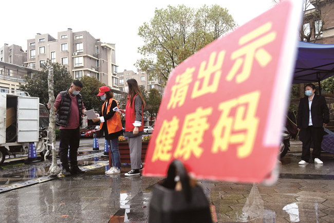 3月17日,在嘉興秀洲區(qū)一家小區(qū)門口,工作人員身著紅馬甲和同伴冒雨堅守在小區(qū)門口,開展替崗輪值,協(xié)助社區(qū)干部對進入小區(qū)的人員逐一驗碼測溫,筑牢疫情防控安全線。(馮玉坤)