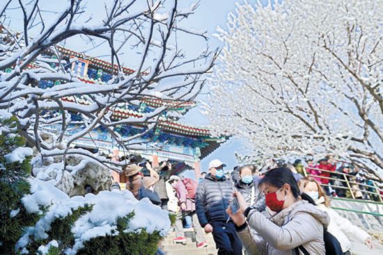 在其他市屬公園,昨天一早亦是同樣盛景——北海公園內(nèi),花雪簇簇映白塔;香山公園內(nèi),蠟梅傲雪更沁香;景山公園內(nèi),飛雪春花映紅墻……春花與雪相遇在園林古建中,共同構(gòu)建出詩(shī)情畫意的三月北京獨(dú)特春景。