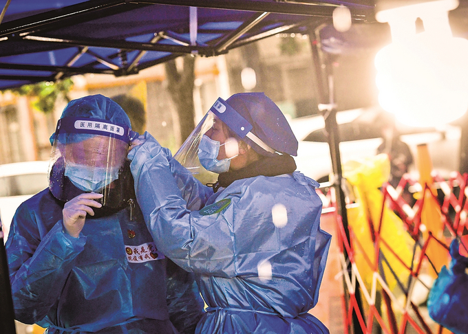 3月20日,南京雨花臺區(qū)梅欣西區(qū)廣場核酸檢測采樣點,雨中堅守的志愿者互相整理起霧的防疫裝備。 本報記者 萬程鵬 攝