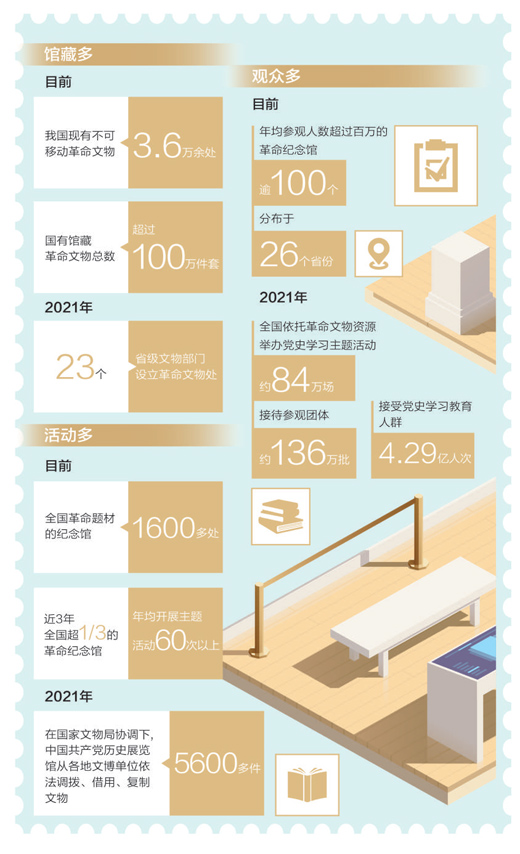 目前,全國革命題材的紀念館有1600多處。近3年全國超過1/3的革命紀念館年均開展主題活動60次以上,即每個月舉辦5次以上主題活動,革命文物展示手段不斷豐富。2021年,在國家文物局協(xié)調下,中國共產黨歷史展覽館從各地文博單位依法調撥、借用、復制文物5600多件。