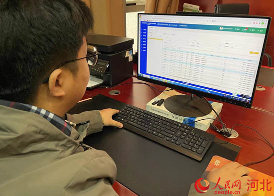 工作人員通過河北省建筑工人實名制和分賬制管理公共服務(wù)平臺監(jiān)測某項目農(nóng)民工考勤記錄。 人民網(wǎng) 林福盛攝
