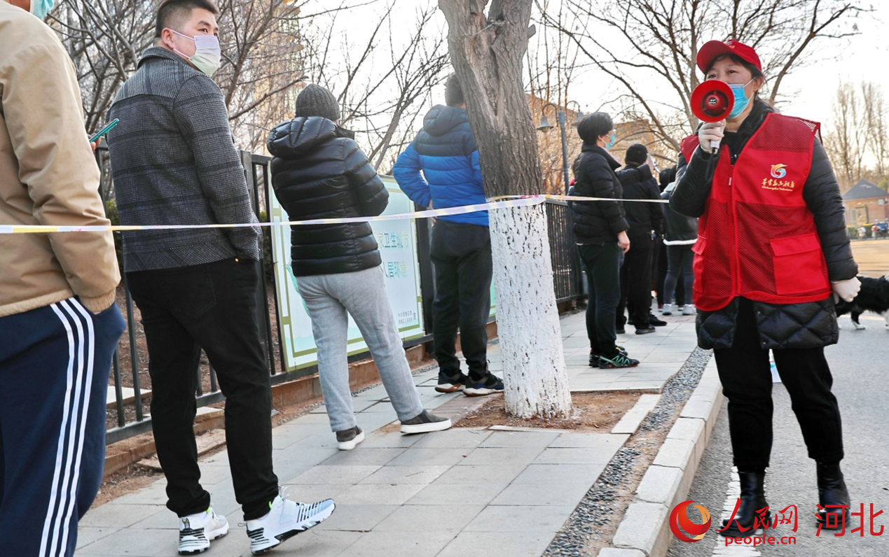 在河北省秦皇島市海港區(qū)白塔嶺街道森林逸城社區(qū)內(nèi),黨員志愿者正在維持現(xiàn)場秩序。 曹建雄攝